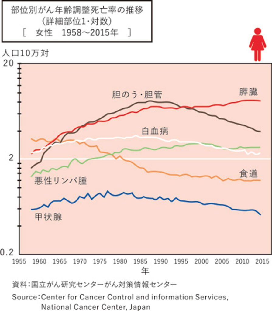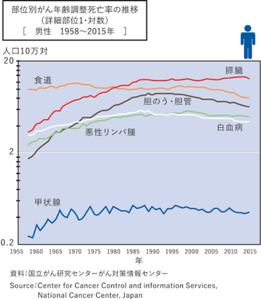 膵臓がん、胆道がん(胆のうがん、胆管がん)はいずれも予後の悪いがんで、症状が出た時にはすでに手遅れということが少なくありません。下図のように、部位別のがんの年齢調整死亡率(昭和60年の年齢構成に合わせた10万人当たりの死亡者数)でみると、食道がんなど多くのがんは近年減少傾向にありますが、膵臓がんは男女ともいまだ増加傾向です。また膵臓がんや胆道がんは、通常の人間ドックでは早期発見が難しいがんでもあります。