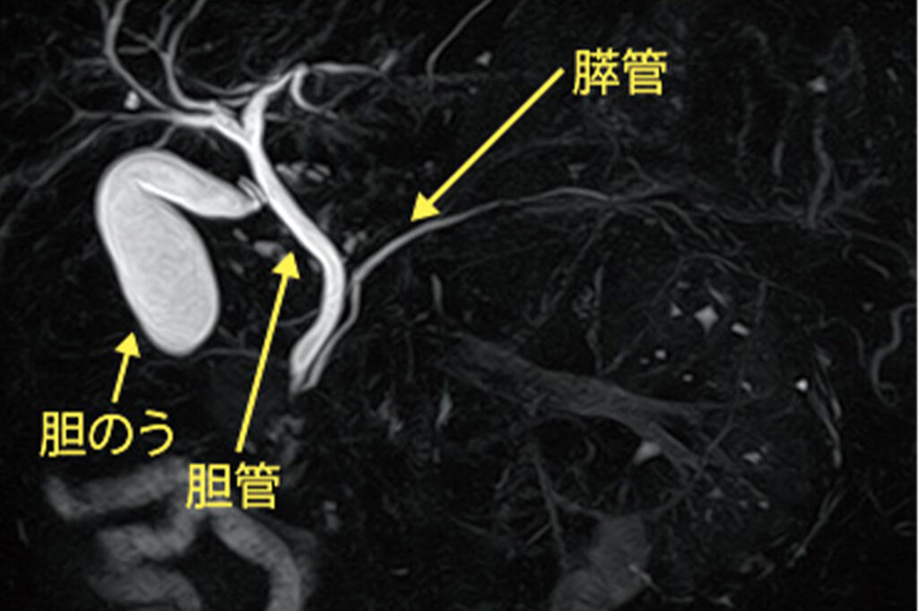 近年、MRIの技術が進歩し、造影剤を使わなくても膵管や胆管の詳細な描出が可能になりました。MRCPはMagnetic Resonance Cholangiopancreatographyの略で、MRIの技術で膵管、胆管を詳細に写し出すことのできる検査です。