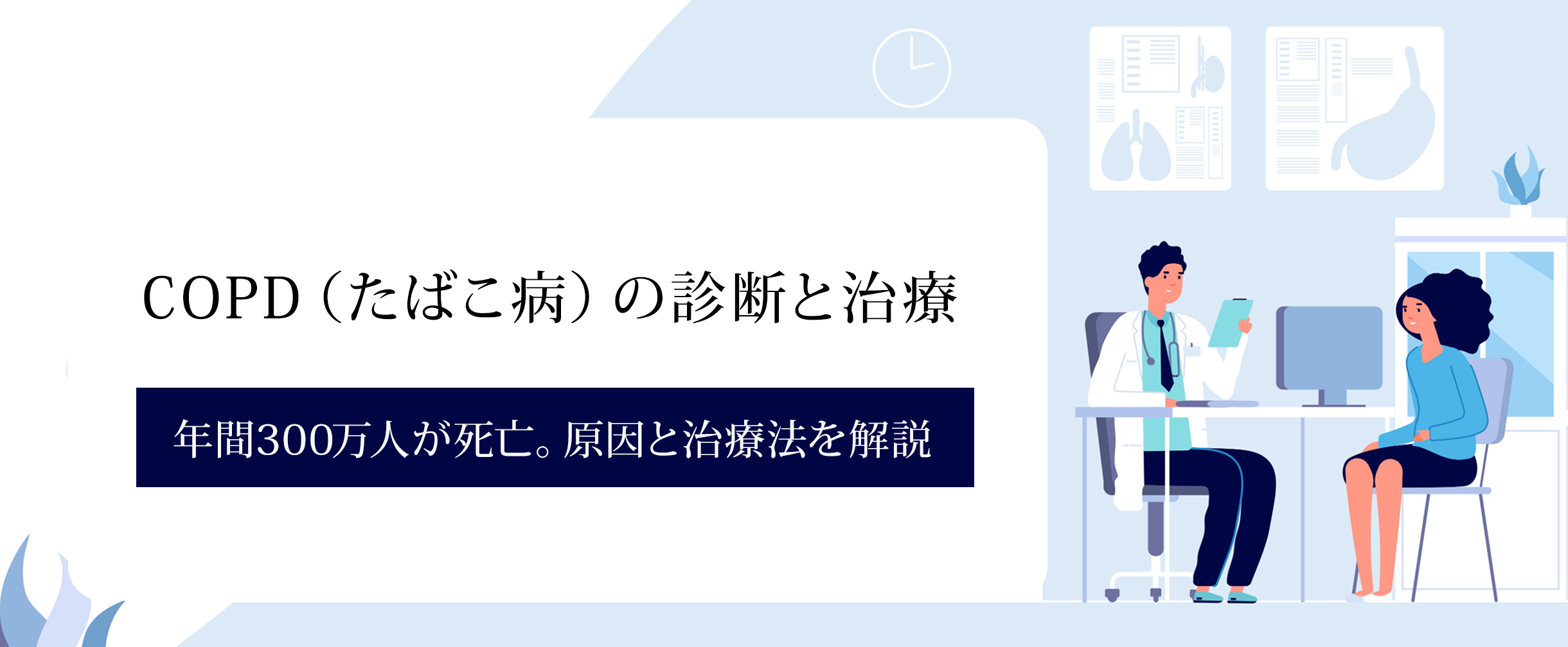 COPD(慢性閉塞性肺疾患)は、呼吸器領域での代表的な疾患です。以前は「肺気腫」「慢性気管支炎」という名称でしたが、現在はCOPDに統一されています。COPDは、気道の一番末端にある肺胞が破壊されたり、気道の炎症が起きて呼吸困難となり、最悪は死に至るという疾患です。世界で年間300万もの人がこのCOPDで亡くなっています。年々患者数は増加しており、2030年までには世界の主要死因の第3位になると予想されています。