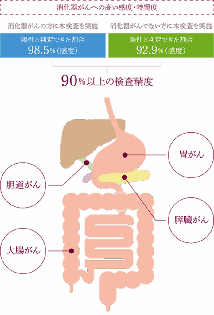 がんなどの異物に対して、体が反応して出している物質を抽出することにより、がん発生のリスクを調べることができる最新の技術です。これを遺伝子レベルで調べます。この検査で調べることができるのは、胃がん、大腸がん、すい臓がん、胆道がんの4種類です。90%以上の高い精度で発見することができます。