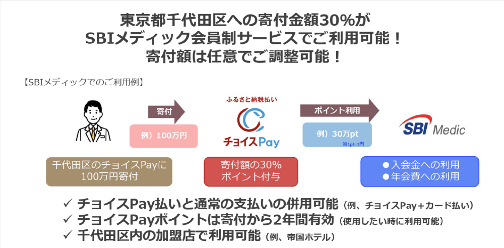 2. 東京都千代田区への寄付: SBIメディックは、東京都千代田区のチョイスPay加盟店として承認されています。そのため、千代田区へふるさと納税をすることで得られたポイントを、SBIメディックのサービス利用料に充当できます。