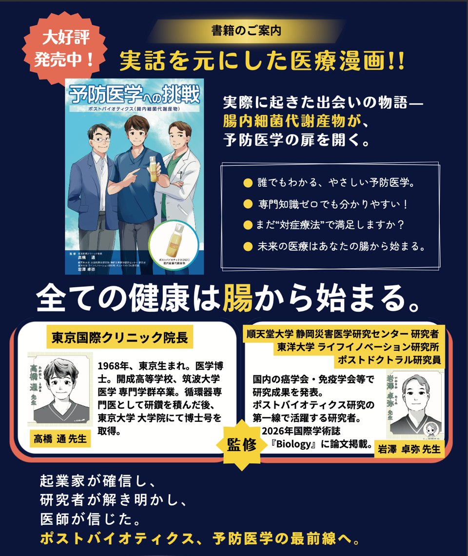 提携医療機関の東京国際クリニック 院長高橋のメディカルコミック「予防医学への挑戦ーポストバイオティクス(腸内細菌代謝産物)ー」が、発売されました。